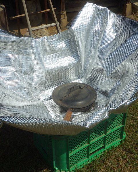 この強い日差しを活かして自作のソーラークッカーで胡麻を煎っているところ
